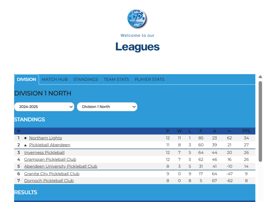 The results and statistics of the different matches can be checked in the following link: https://www.pickleballscotland.org/leagues